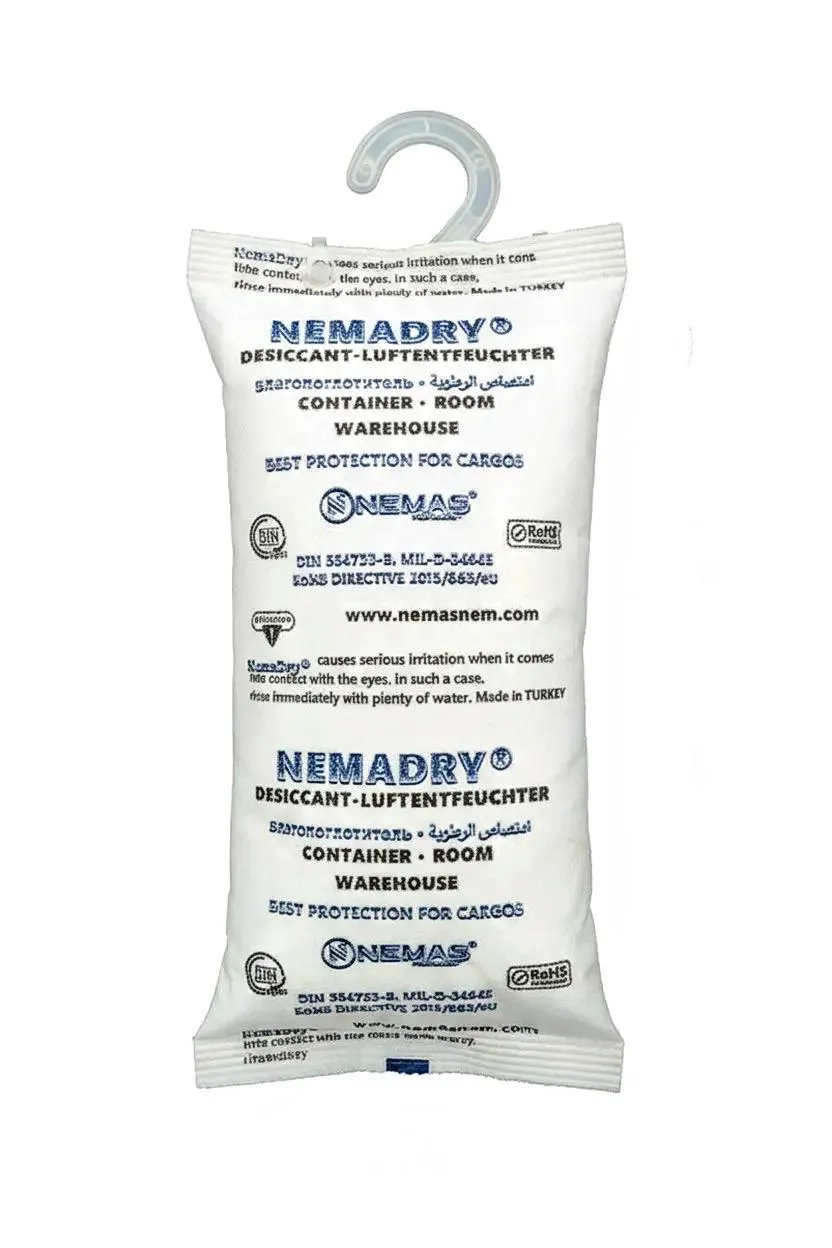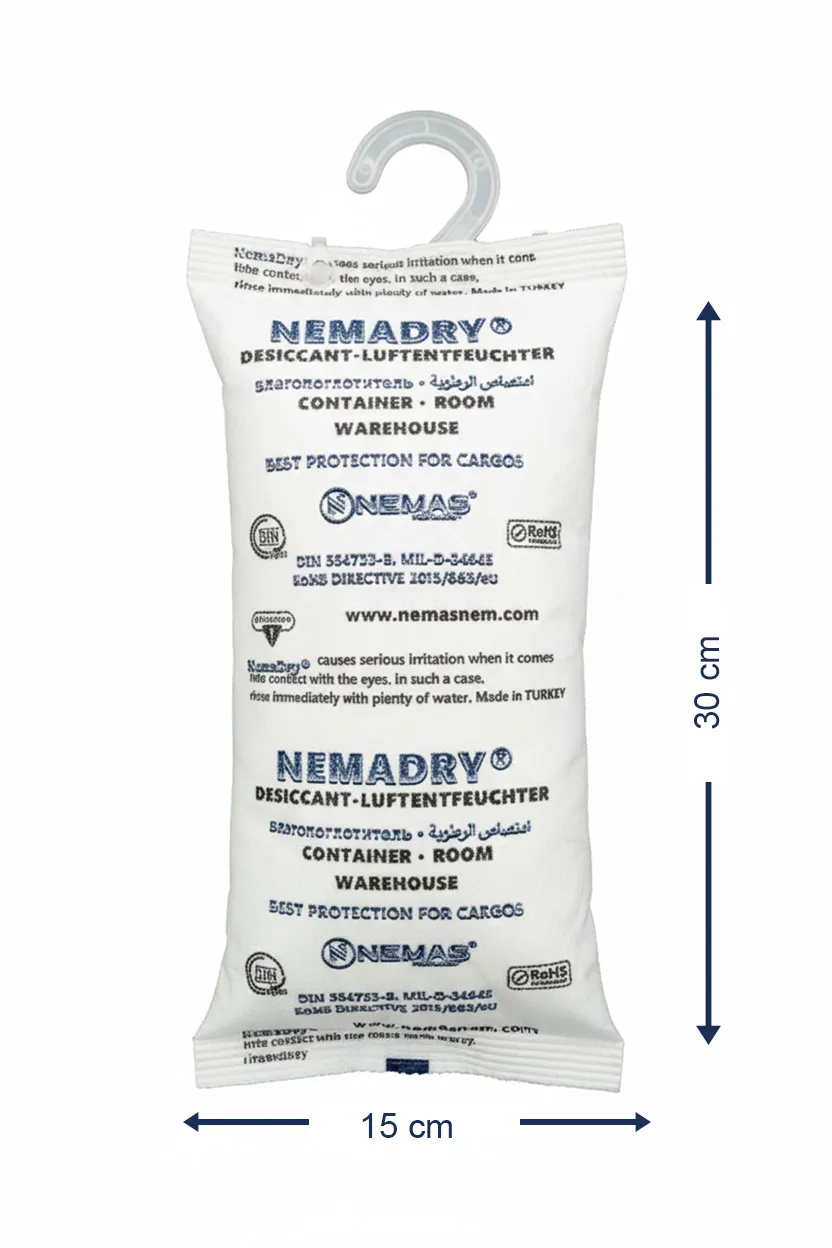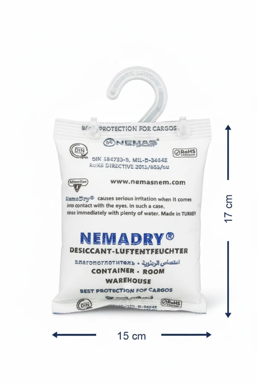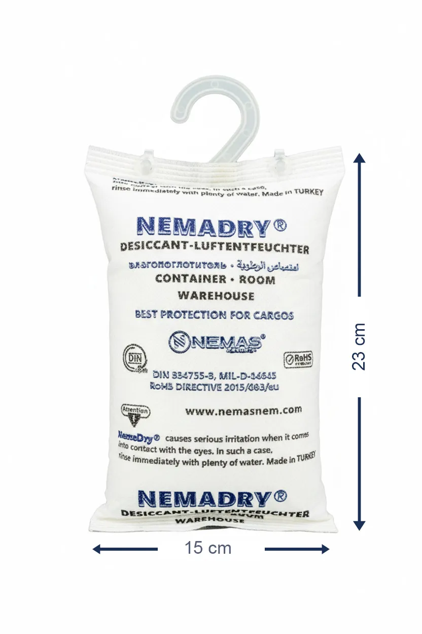 kadar ve hacminin %300'üne kadar adsorbe edebilir. nem adsorbsiyon kapasitesi DIN 55473 ve MIL-D-3464E standartlarına uygundur. Nem rutubet ,korozyon, küf ve bozulma dahil bekleme ve sevkiyat esnasında zararlı etkilerle mücadele için ürün ambalajındaki nemi etkili bir şekilde absorbe eden nem alıcı ve kurutucudur. nem rutubet ve korozyona hasarına karşı alanı ve ürünü korur ve güvende tutar.NEMADRY®; kapalı alanlar içindeki nem tahribatını önlemek için basit, güvenilir ve ekonomik çözümler ile aracı olan nem alıcı, ihracat ürünleri ve diğer kapalı alan ve o alanda bulunan ürünler için kuru bir ortam sağlayarak koruma altına alır. Kapalı alan içerisine konulan NEMADRY®, alanda nemle etkin bir şekilde absorbe olur ve bu da nem, korozyon, küf ve rutubet gibi zararlı etkilerin önlenmesine yardımcı olur.