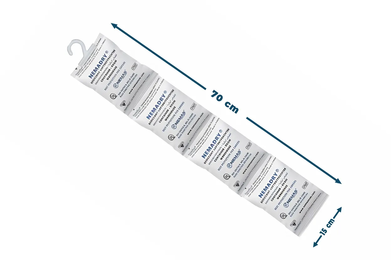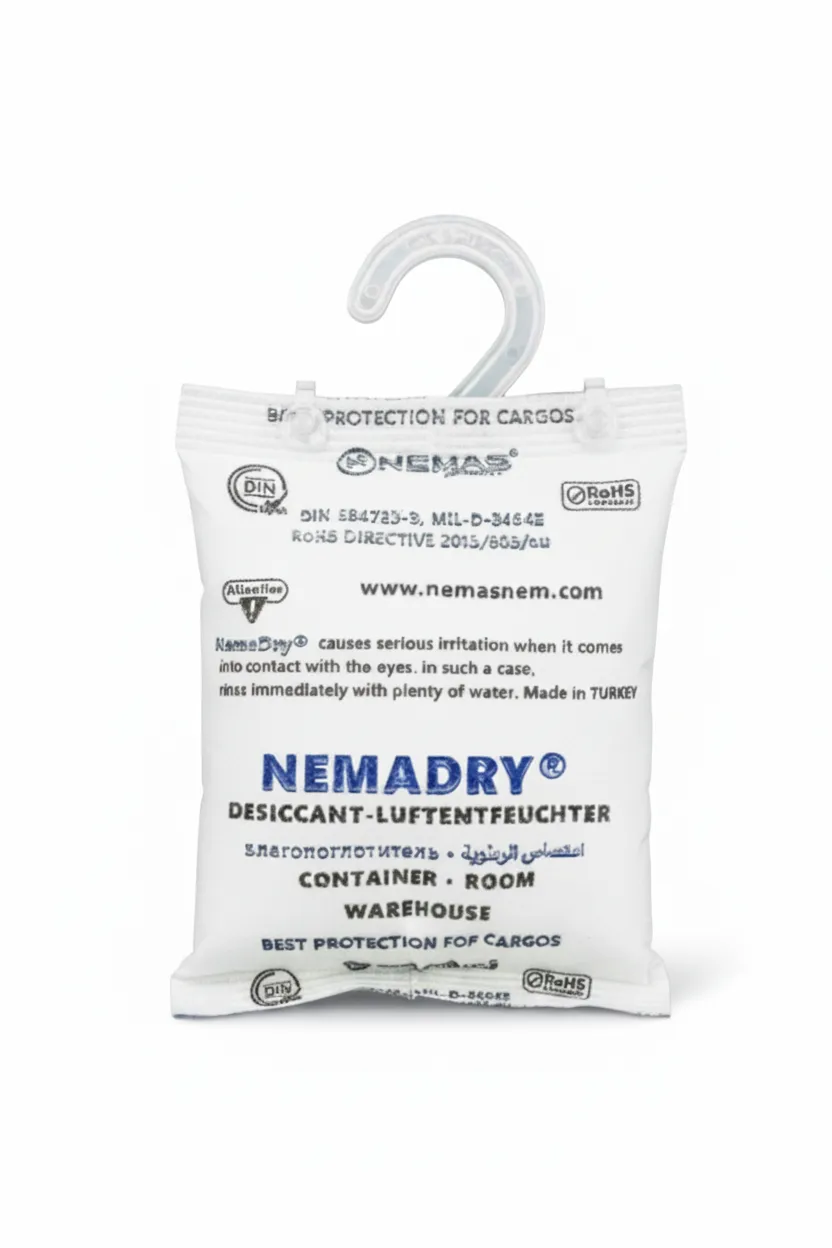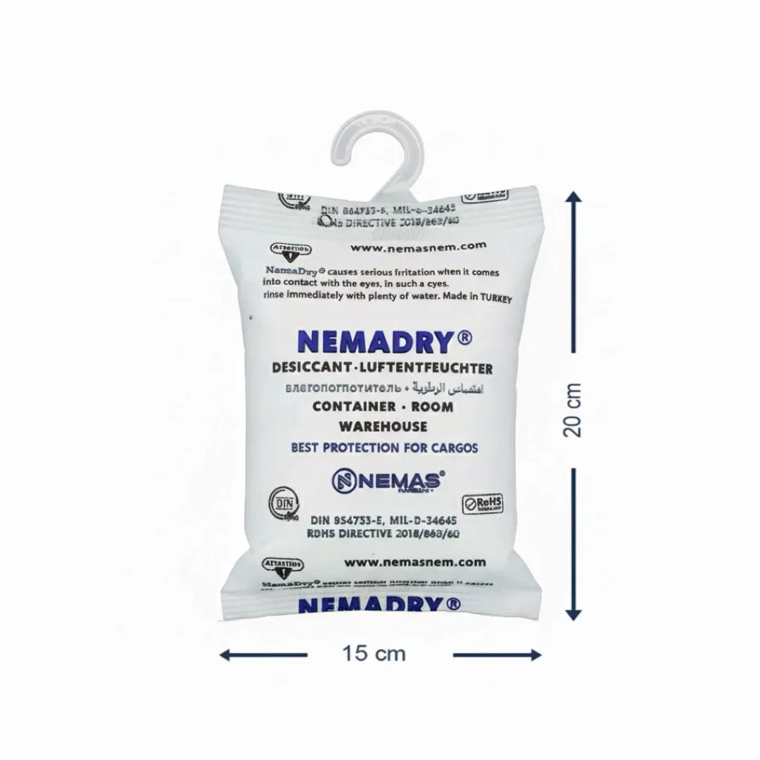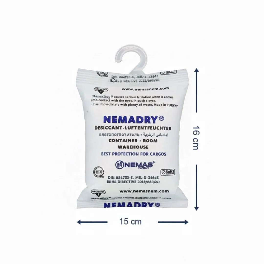kadar ve hacminin %300'üne kadar adsorbe edebilir. nem adsorbsiyon kapasitesi DIN 55473 ve MIL-D-3464E standartlarına uygundur. Nem rutubet ,korozyon, küf ve bozulma dahil bekleme ve sevkiyat esnasında zararlı etkilerle mücadele için ürün ambalajındaki nemi etkili bir şekilde absorbe eden nem alıcı ve kurutucudur. nem rutubet ve korozyona hasarına karşı alanı ve ürünü korur ve güvende tutar.NEMADRY®; kapalı alanlar içindeki nem tahribatını önlemek için basit, güvenilir ve ekonomik çözümler ile aracı olan nem alıcı, ihracat ürünleri ve diğer kapalı alan ve o alanda bulunan ürünler için kuru bir ortam sağlayarak koruma altına alır. Kapalı alan içerisine konulan NEMADRY®, alanda nemle etkin bir şekilde absorbe olur ve bu da nem, korozyon, küf ve rutubet gibi zararlı etkilerin önlenmesine yardımcı olur.
