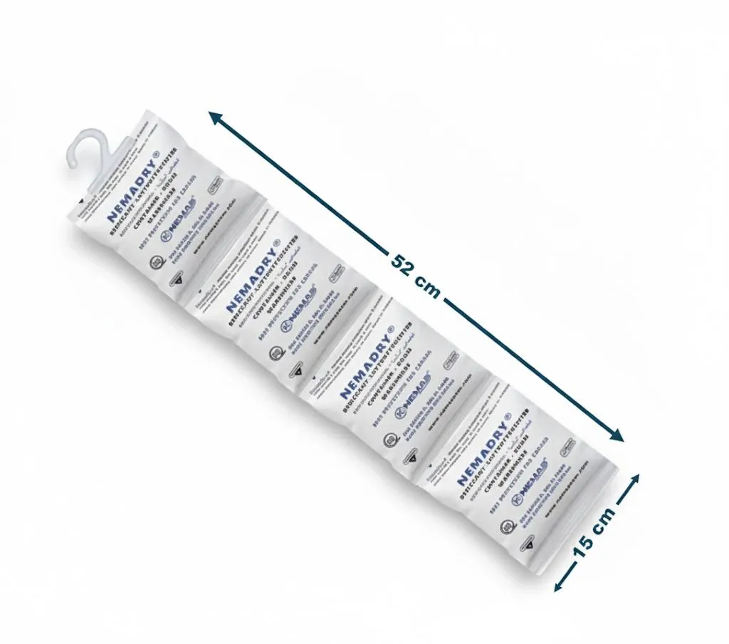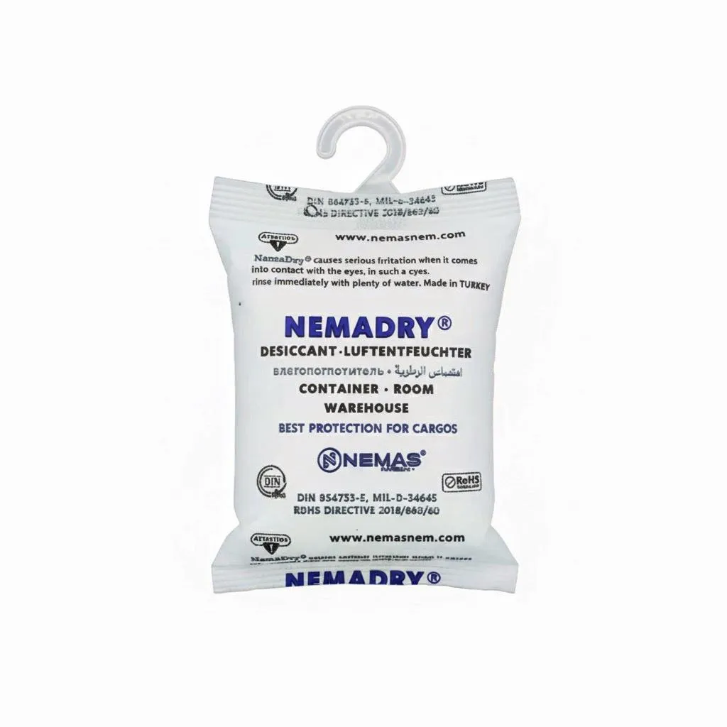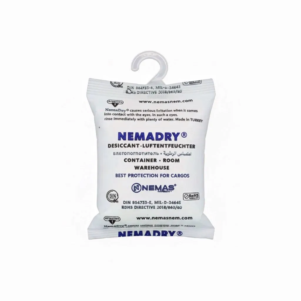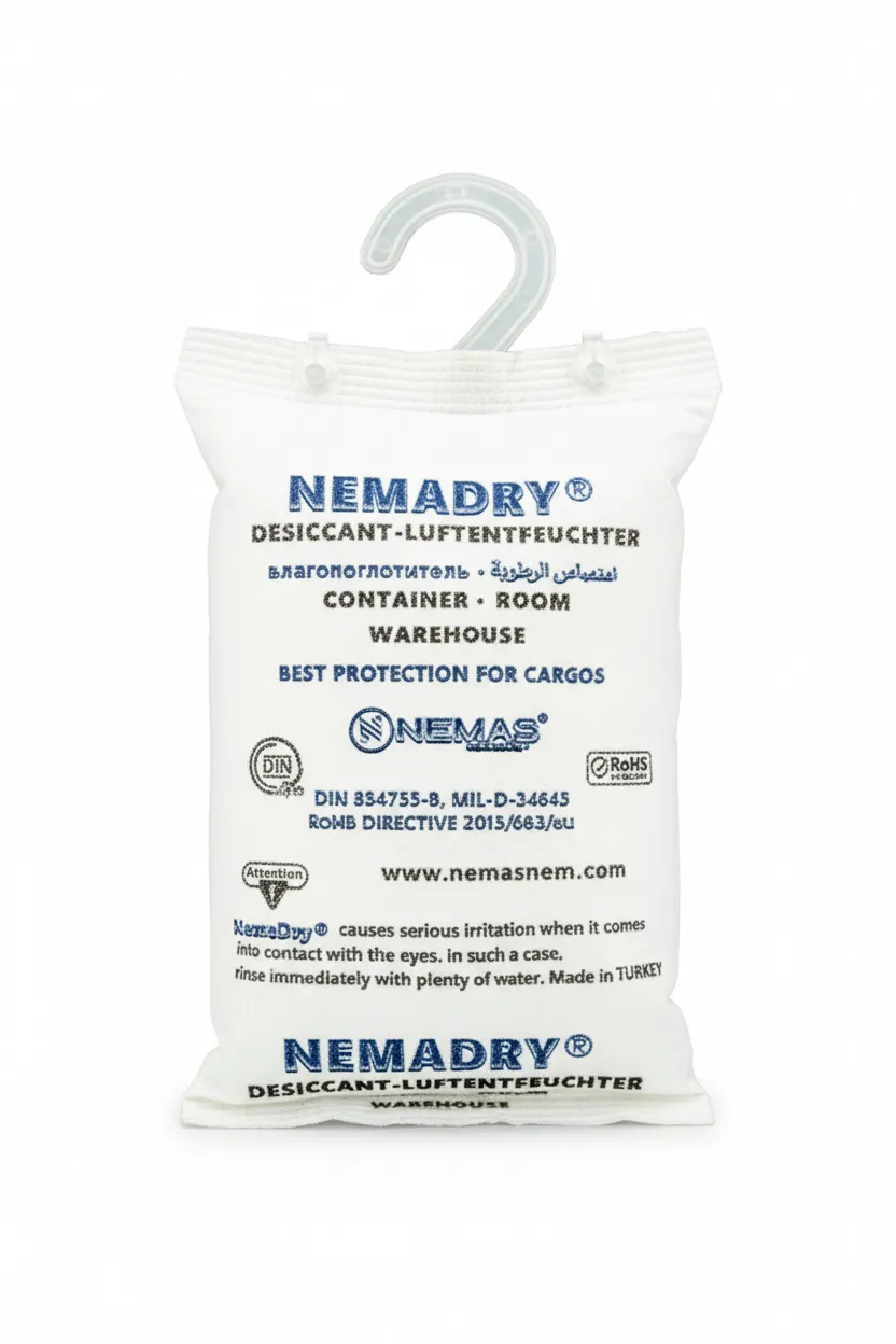 kadar ve hacminin %300'üne kadar adsorbe edebilir. nem adsorbsiyon kapasitesi DIN 55473 ve MIL-D-3464E standartlarına uygundur. Nem rutubet ,korozyon, küf ve bozulma dahil bekleme ve sevkiyat esnasında zararlı etkilerle mücadele için ürün ambalajındaki nemi etkili bir şekilde absorbe eden nem alıcı ve kurutucudur. nem rutubet ve korozyona hasarına karşı alanı ve ürünü korur ve güvende tutar.NEMADRY®; kapalı alanlar içindeki nem tahribatını önlemek için basit, güvenilir ve ekonomik çözümler ile aracı olan nem alıcı, ihracat ürünleri ve diğer kapalı alan ve o alanda bulunan ürünler için kuru bir ortam sağlayarak koruma altına alır. Kapalı alan içerisine konulan NEMADRY®, alanda nemle etkin bir şekilde absorbe olur ve bu da nem, korozyon, küf ve rutubet gibi zararlı etkilerin önlenmesine yardımcı olur.